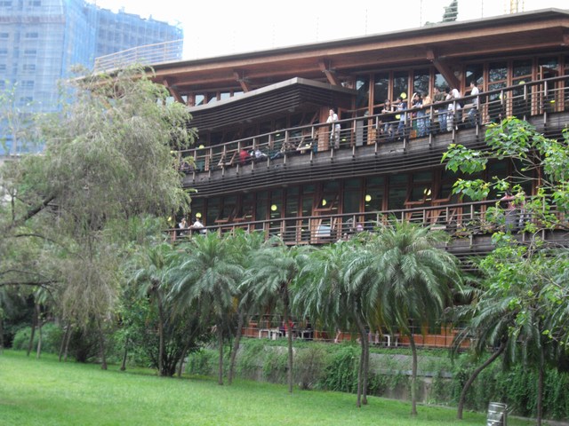 再沿著石頭小徑往裡頭走...不知道的人會以為大概已經到了公園的盡頭~ 卻沒想到 山窮水盡疑無路 柳暗花明又一村,一座很特別的建築物就在眼前漸漸的冒出頭來了...搭配上周圍的荷花池,,與花花草草..我還以為是starbuck在這邊的旗艦店ㄋ~